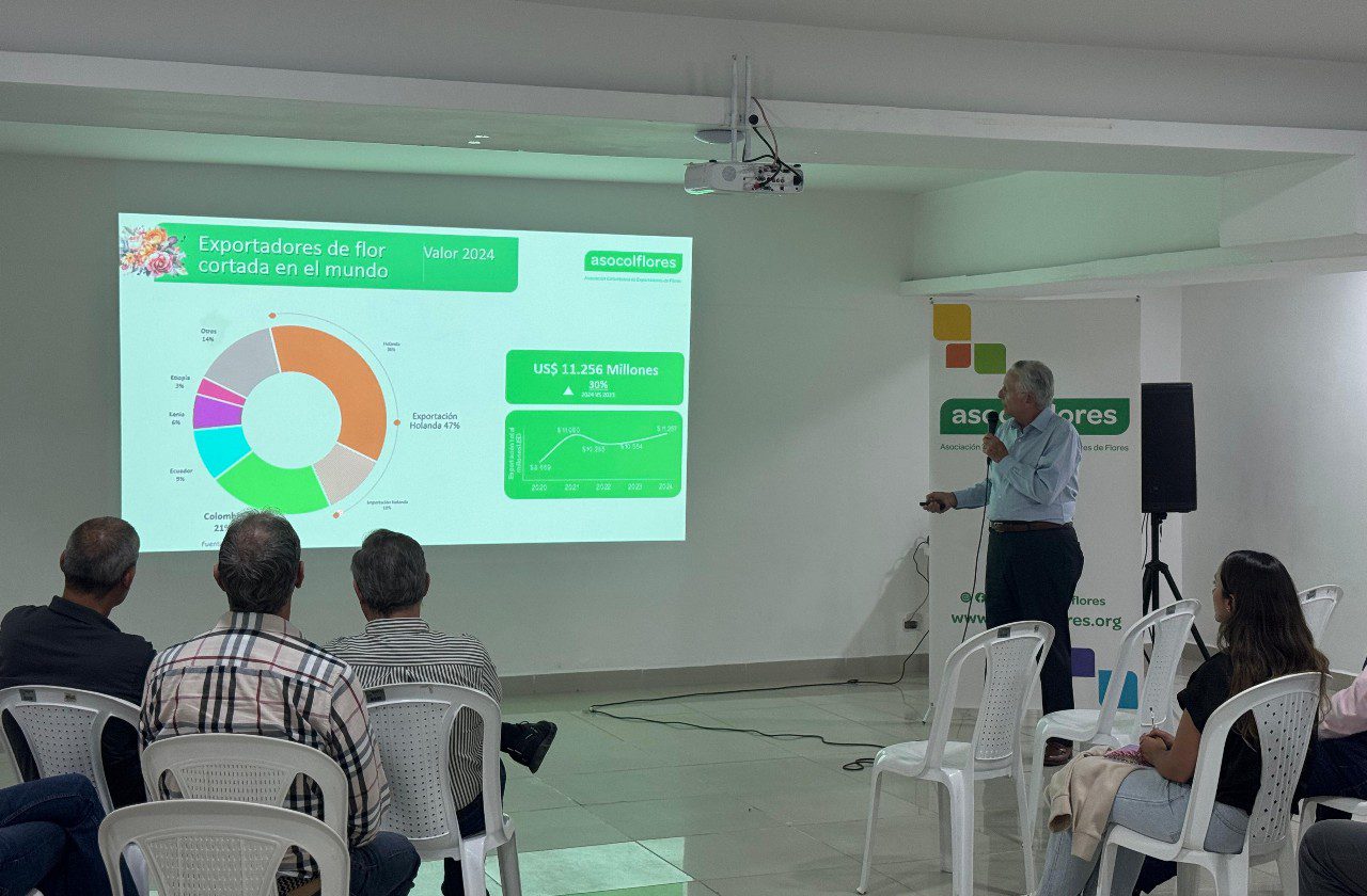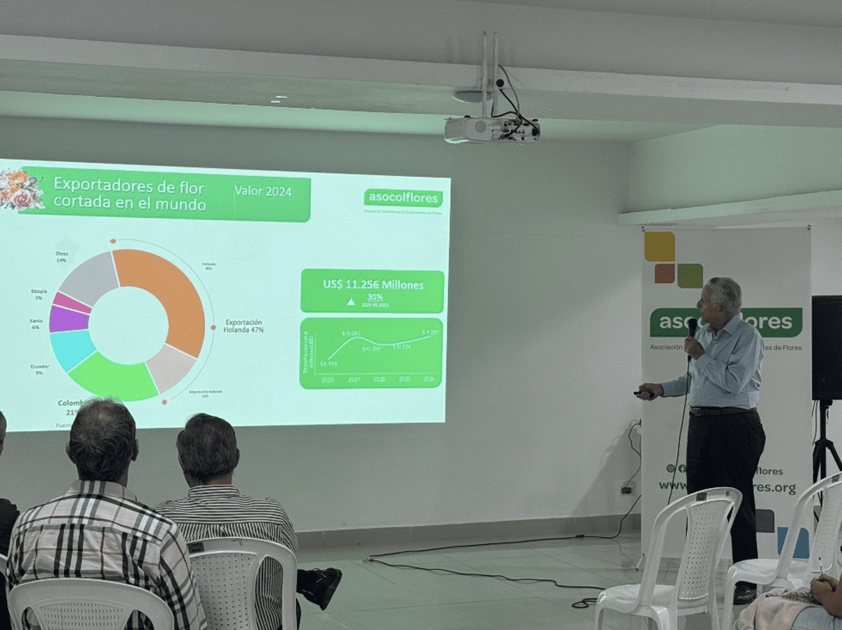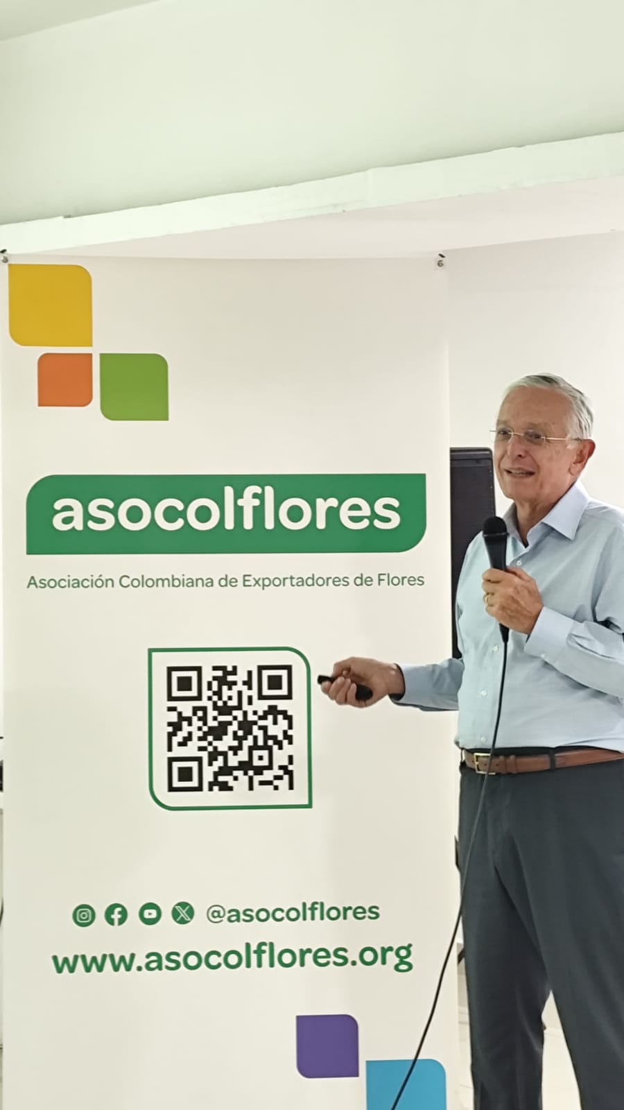 Durante la jornada, el presidente ejecutivo de Asocolflores, Augusto Solano, compartió un completo análisis sobre el contexto actual del sector, resaltando cifras y estadísticas clave. Su intervención permitió comprender los principales desafíos de la floricultura colombiana y proyectar acciones estratégicas para seguir posicionando al sector como un motor de desarrollo regional y nacional.
