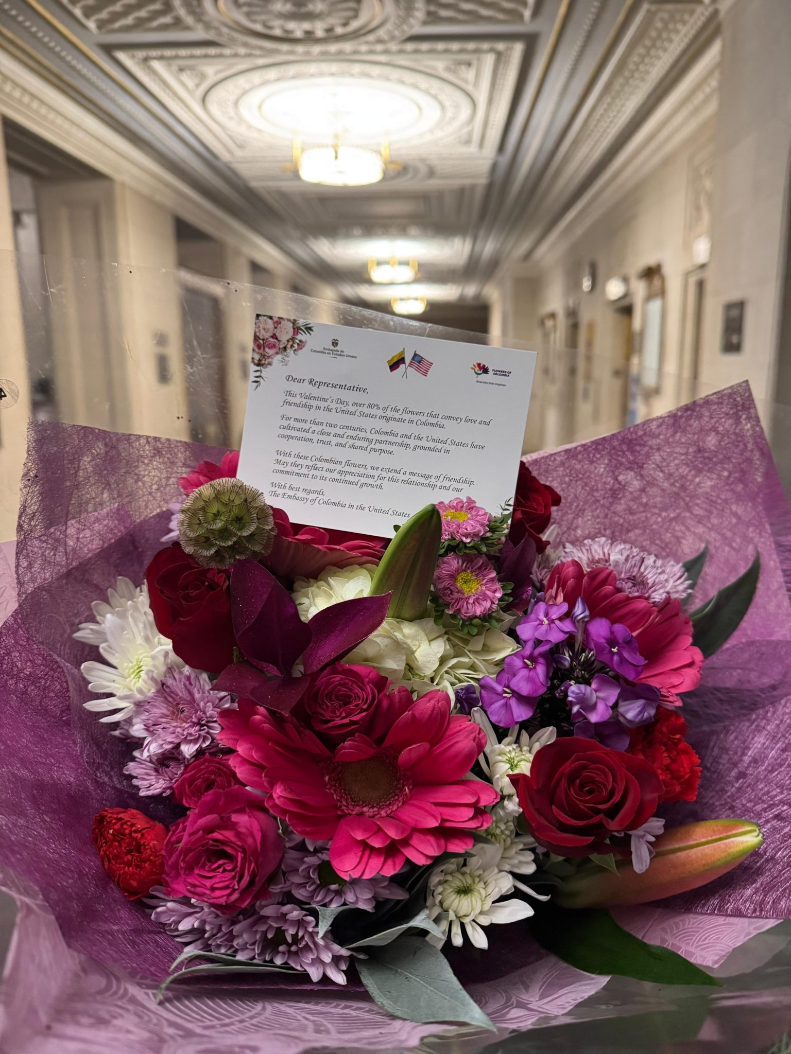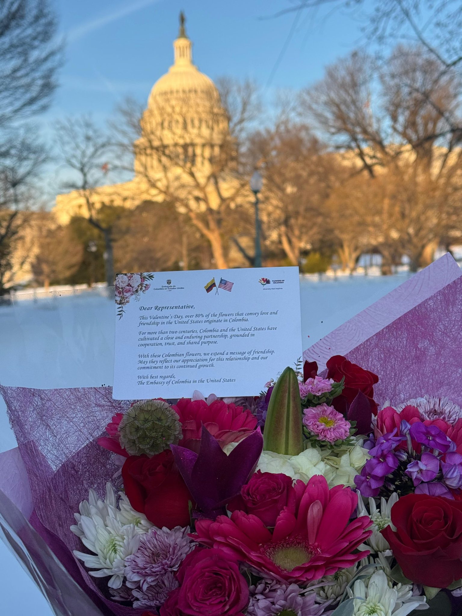 Bogotá, febrero 2026; En el marco de la temporada de San Valentín 2026, la Embajada de Colombia en Estados Unidos, en articulación con Asocolflores, lideró la entrega de arreglos florales colombianos a las 535 oficinas del Congreso en el Capitolio en Washington D.C., como un gesto simbólico que resalta la solidez de la relación bilateral entre ambos países y la importancia estratégica de la floricultura colombiana en el mercado estadounidense.